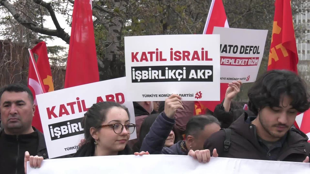 'Utanç verici bildiriyi kabul etmiyoruz, o imza geri çekilmeli!' yazılı pankartın ardında toplanan TKP'liler 'Kahrolsun ABD emperyalizmi', 'Emperyalistler, işbirlikçiler 6. Filoyu unutmayın' ve 'İran halkı yalnız değildir' sloganları atarak 'Katil İsrail işbirlikçi AKP', 'Rezil bildirinizi yırtıp atacağız' ve 'Ülkemizde işbirlikçileri kabul etmiyoruz' yazılı döviz taşıdı.