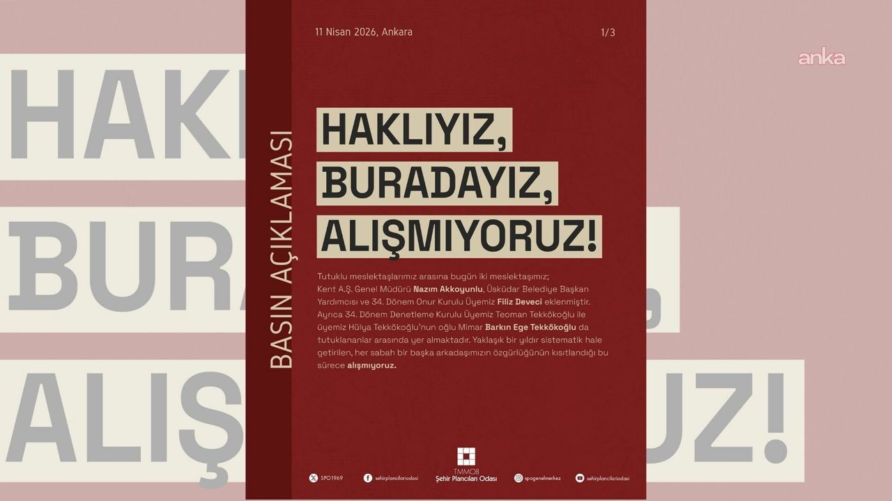 'Tutuklu meslektaşlarımız arasına bugün iki meslektaşımız; Kent A.Ş. Genel Müdürü Nazım Akkoyunlu, Üsküdar Belediye Başkan Yardımcısı ve 34. Dönem Onur Kurulu Üyemiz Filiz Deveci eklenmiştir. Ayrıca 34. Dönem Denetleme Kurulu Üyemiz Teoman Tekkökoğlu ile üyemiz Hülya Tekkökoğlu'nun oğlu Mimar Barkın Ege Tekkökoğlu da tutuklananlar arasında yer almaktadır. Yaklaşık bir yıldır sistematik hale getirilen, her sabah bir başka arkadaşımızın özgürlüğünün kısıtlandığı bu sürece alışmıyoruz. 'İçerideki' şehir plancısı sayısının giderek artması, münferit yargı süreçleri değil; doğrudan planlama disiplininin toplumun yaşam hakkını savunma iradesine yönelik bir müdahaledir. Bu hukuksuzluğun bir rutin haline getirilmesini, her sabah yeni bir tutuklama haberiyle uyanmayı reddediyoruz. Sessizce sıramızı beklemeyeceğiz; bu tabloyu kanıksamıyoruz, alışmıyoruz!
