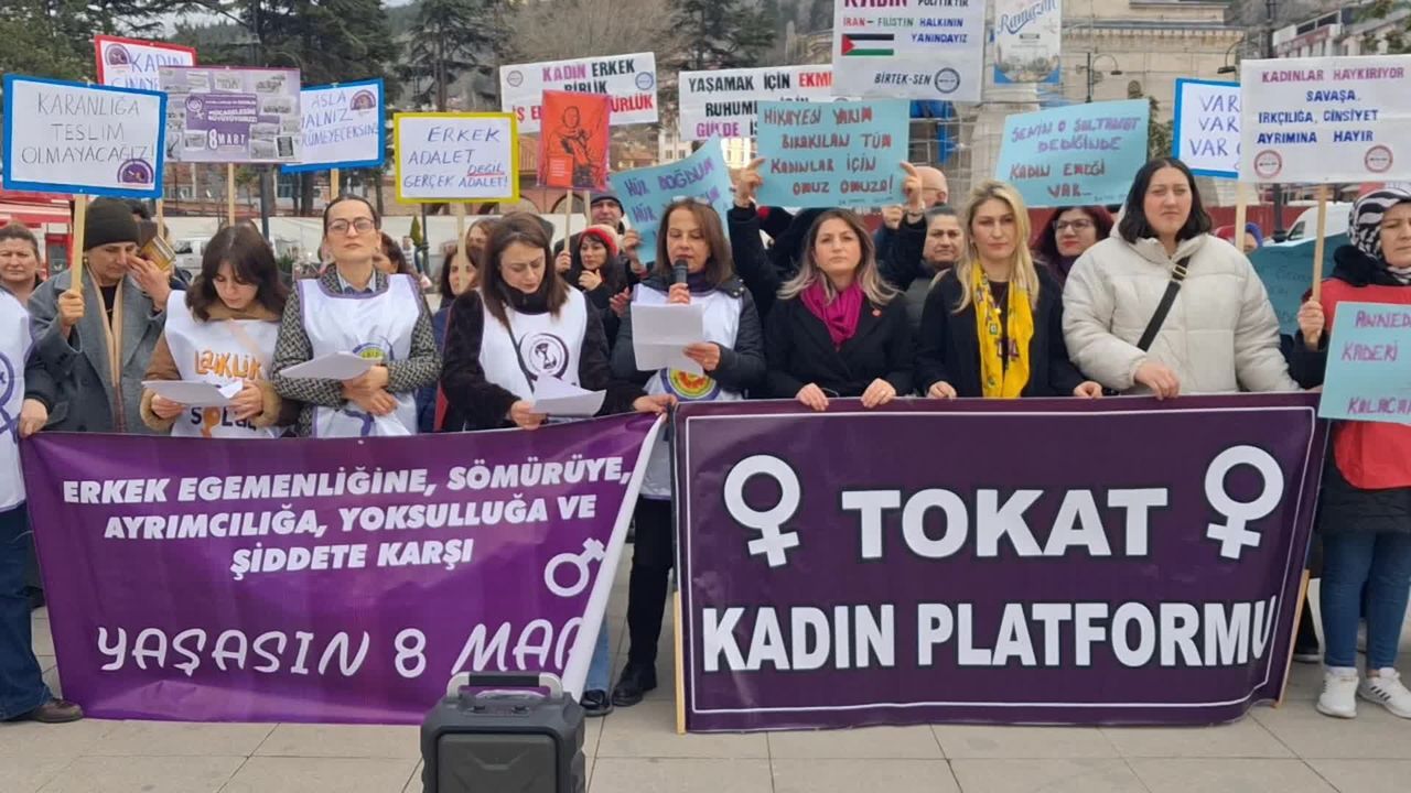 Tokat Kadın Platformu tarafından 8 Mart Dünya Emekçi Kadınlar Günü dolayısıyla Meydan Camisi önünde kitlesel basın açıklaması gerçekleştirildi. Eyleme, aylardır hak mücadelesi veren Şık Makas işçileri de destek verdi.