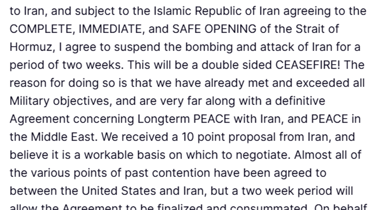 Trump, geçmişteki ihtilafların büyük bölümünde mutabakat sağlandığını ve iki haftalık askıya alma süresinin anlaşmanın tamamlanmasına imkan vereceğini kaydetti. Trump, Orta Doğu ülkelerini temsil eden bir lider olarak bu uzun vadeli sorunun çözümüne yaklaşılmasının kendisi için bir onur olduğunu dile getirdi.